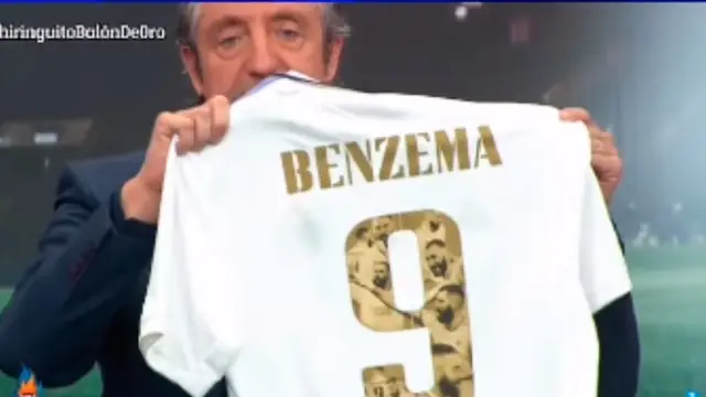 Durante el reconocido programa de la televisión española "El Chiringuito de Jugones", Josep Pedrerol, conductor del show, presentó la camiseta conmemorativa hecha por el Real Madrid tras el Balón de Oro obtenido este lunes por Karim Benzema.