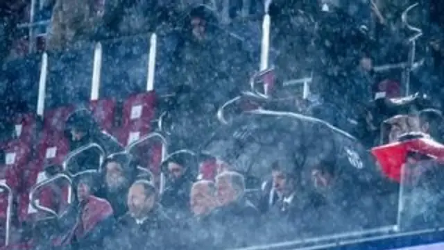 El propio presidente del Oviedo, Martín Peláez, fue uno de los que también soportó firme el momento de aguacero y quedará como una de las secuencias más repetidas en la fecha 21 y que podría ser recurrente si las lluvias continúan esta intensidad en Barcelona.