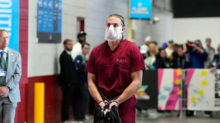 Además, en sus manos sostenía una camiseta de su equipo colegial, la cual se colocó posteriormente en el calentamiento previo al compromiso y tenía una especie de mascara que le tapaba la zona de la boca.