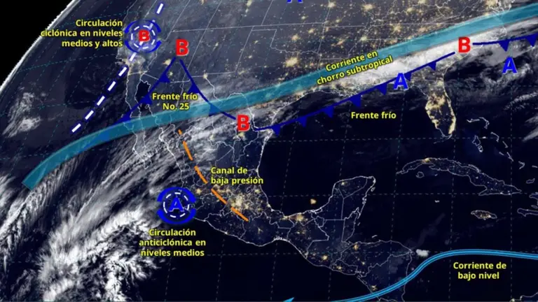 En este sentido, varios estados serán afectados significativamente debido al Frente Frío 25, el cual desencadenará heladas en el norte, alcanzando temperaturas mínimas de -15° Celsius. Además, la influencia de la incorporación ciclónica en niveles medios y altos de la atmósfera, así como las corrientes de un chorro tropical y subtropical, ocasionará heladas y fuertes vientos en zonas montañosas.