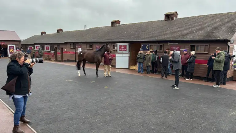 Como una de las principales atracciones del segundo día de la subasta de yeguas de diciembre de Tattersalls, se esperaba la visita de algunos visitantes. La ganadora de múltiples carreras de grupo 1, que había sido copropiedad de Taylor Made's Medallion Racing, posó alegremente con sus admiradores antes de reanudar su comida.